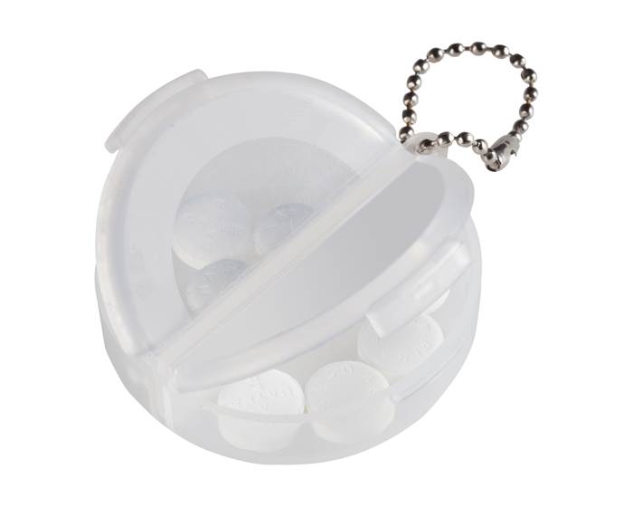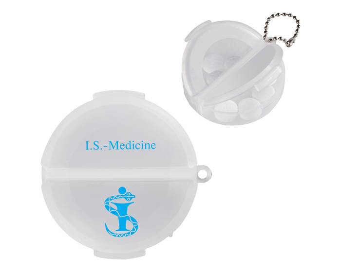 Pastillero de plástico translúcido con doble tapa y dos divisiones, para control de dosis medicinales.