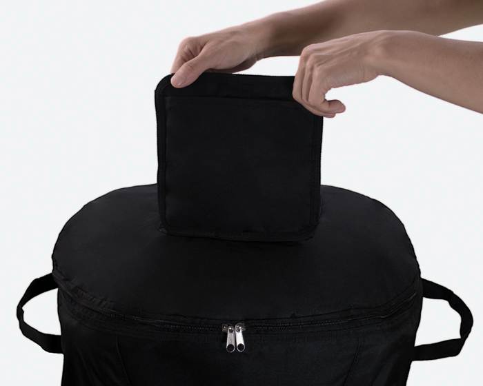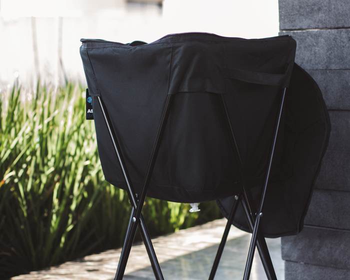 Hielera con base de metal plegable, tapa con compartimento, asas laterales y pivote para extracción de líquidos. Incluye estuche para guardar.