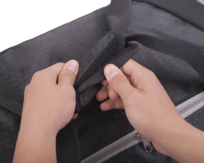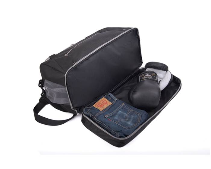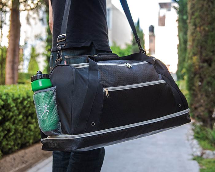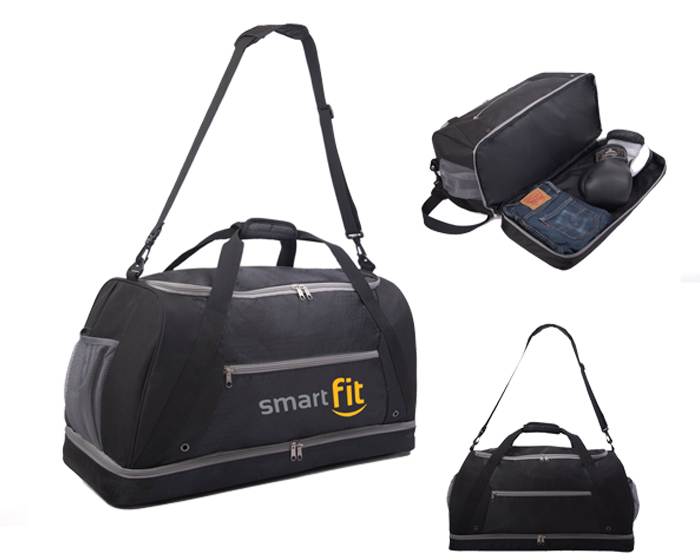 Maleta deportiva, con dos compartimentos, uno para guardar tenis o toalla y el segundo para objetos de viaje como ropa. Cuenta con dos bolsas laterales de malla, asa central ajustable, asa lateral.